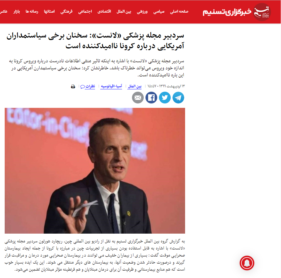 日本视频门户网坐“Oricon”发布题为《〈柳叶刀〉总编认为不该将疫情会商当做地缘斗争的一部门》的文章。